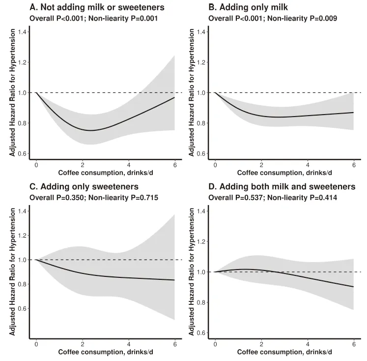 The analysis found that there was a U-shaped association between the intake of unsweetened coffee and new hypertension, regardless of the type of coffee and whether milk was added, while there was no association between sugared coffee and the risk of new hypertension.